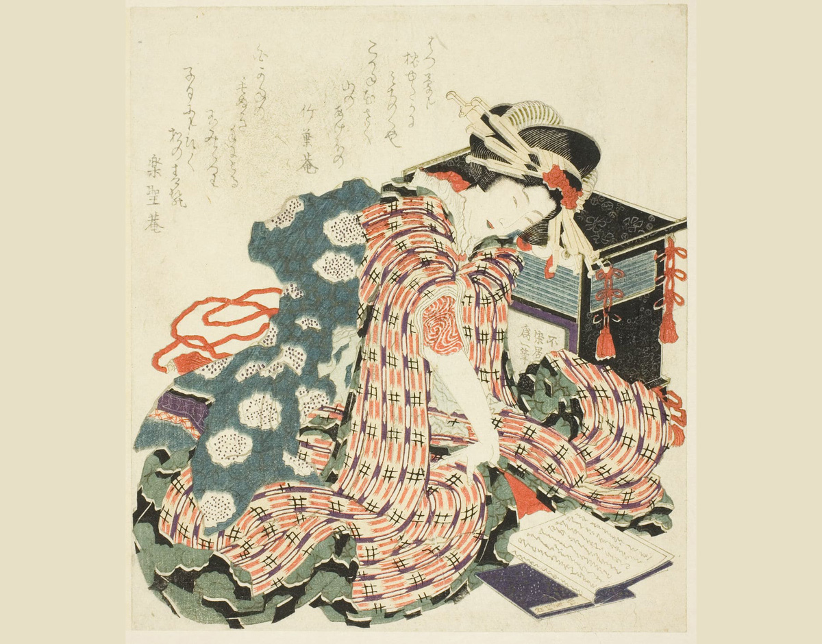 A pretty girl, not wearing a hakama, who has deliberately left the two flaps of her summer surcoat open, along which hang the uzuchi (little sticks) and the precious medicinal ball, and stands by the balustrade of the terrace, hiding her face with her fan.
