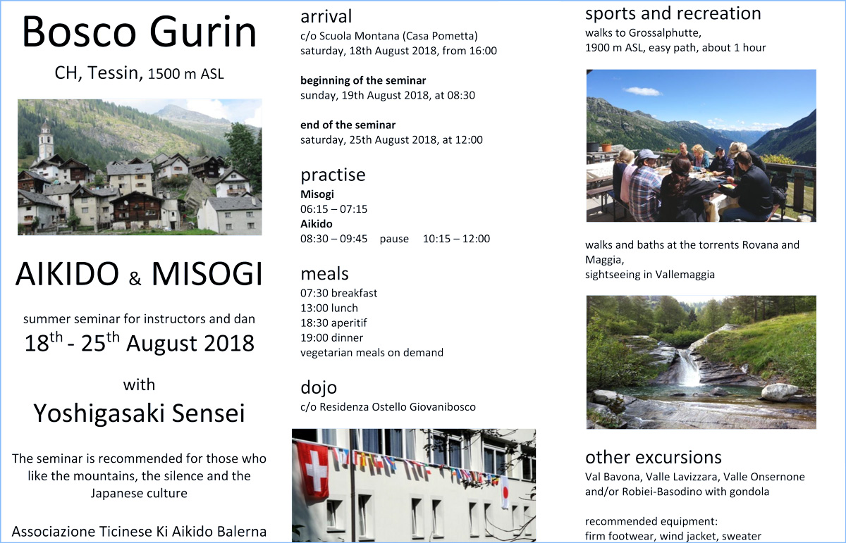 From August 18-25, 2018, the tenth Aikido and Misogi seminar with Yoshigasaki Sensei at Bosco Gurin took place, organized by the Ticino Association for Ki Aikido Balerna.
