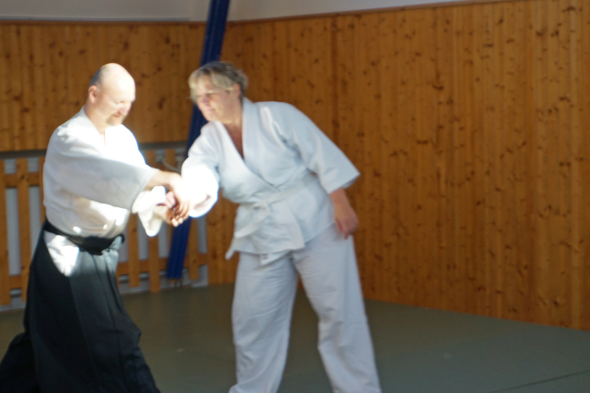 Bernhard continued then the lessons. First it was about falling and rolling, forward and backward. There were various exercises with and without a partner and many techniques in which Uke had to fall. Especially the large forms of falling gave a lot of fun and the participants sweated well.