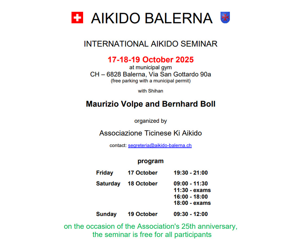 Für das 3. Wochenende im Oktober hatte die Associazione Ticinese Ki Aikido (ATKA) zu ihrem diesjährigen Herbstseminar mit Maurizio Volpe und Bernhard Boll eingeladen.