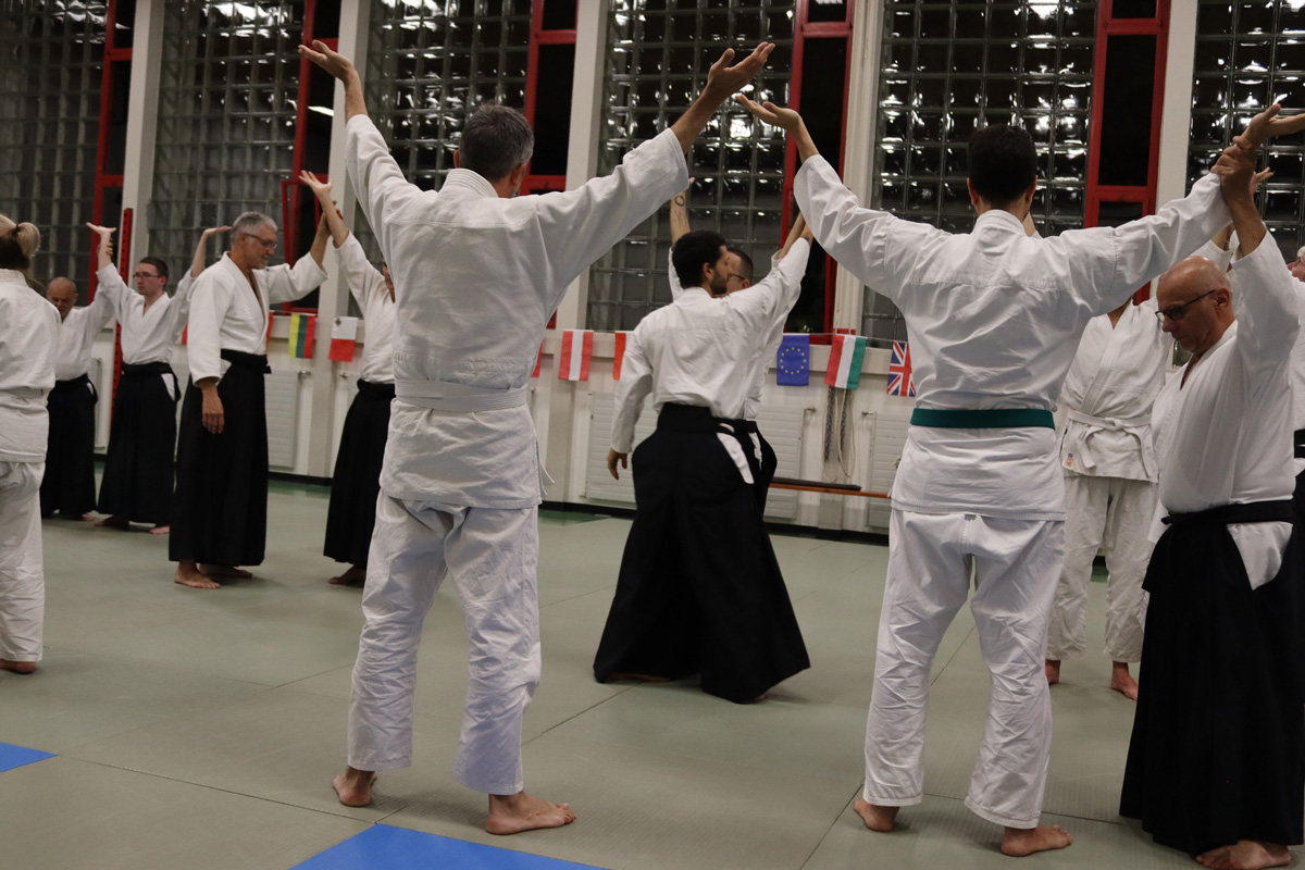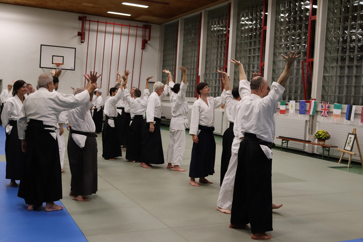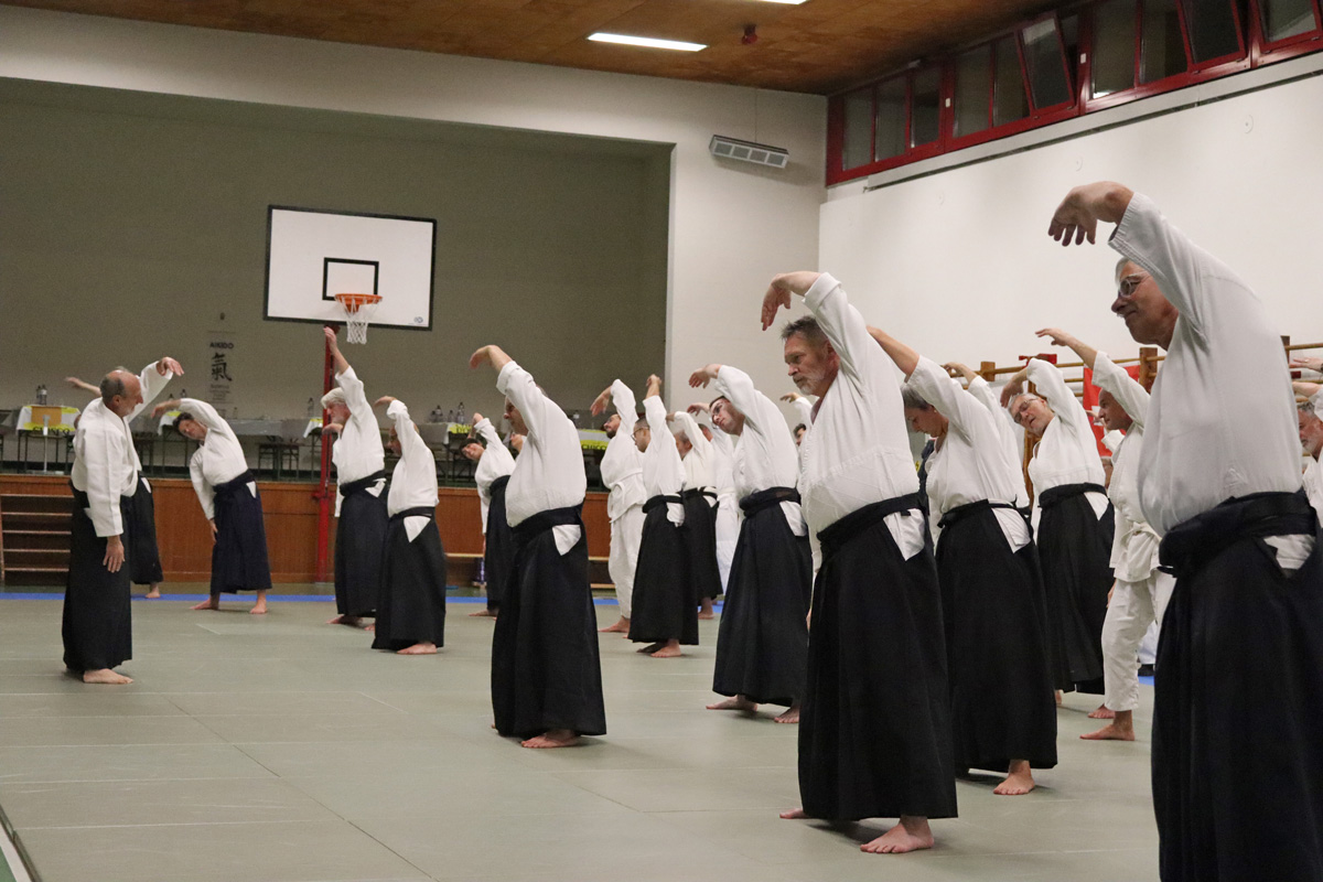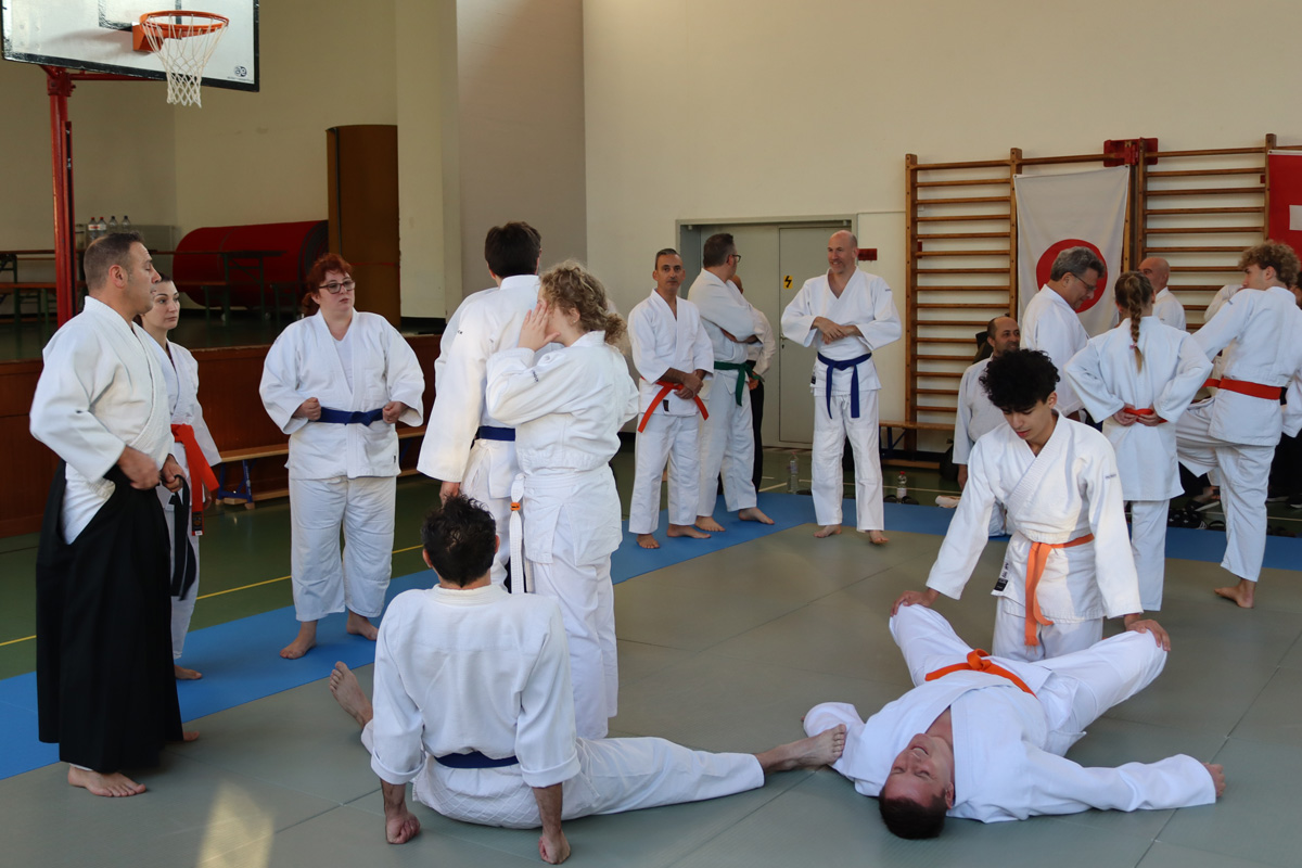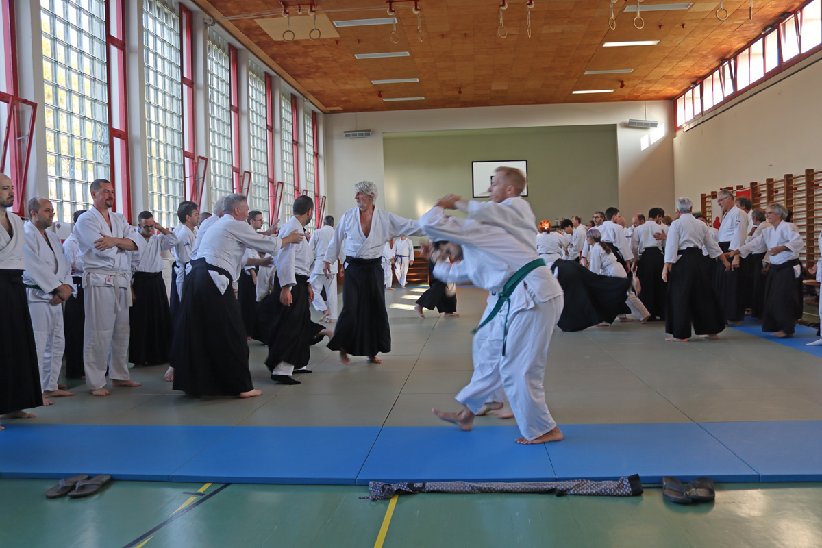Schon am Freitagabend war die Matte gut gefüllt mit Teilnehmern aus der Schweiz, aus Ronchamp, aus Norditalien, aus Wien, aus Prag und aus Nürnberg. Eine grosse Gruppe aus Lüttich vom Ki Aikido de Sclessin war zwar zeitig in ihrer Unterkunft, der Casa Zen in Balerna, angekommen. Aber nach der langen Reise von 800 km in 5 Autos wollten sie sich erst einmal etwas ausruhen und nahmen am Freitagstraining noch nicht teil.