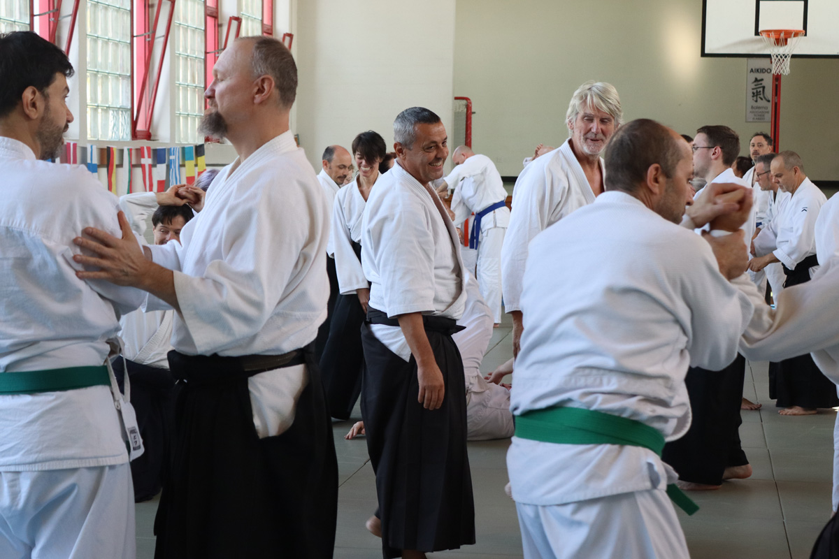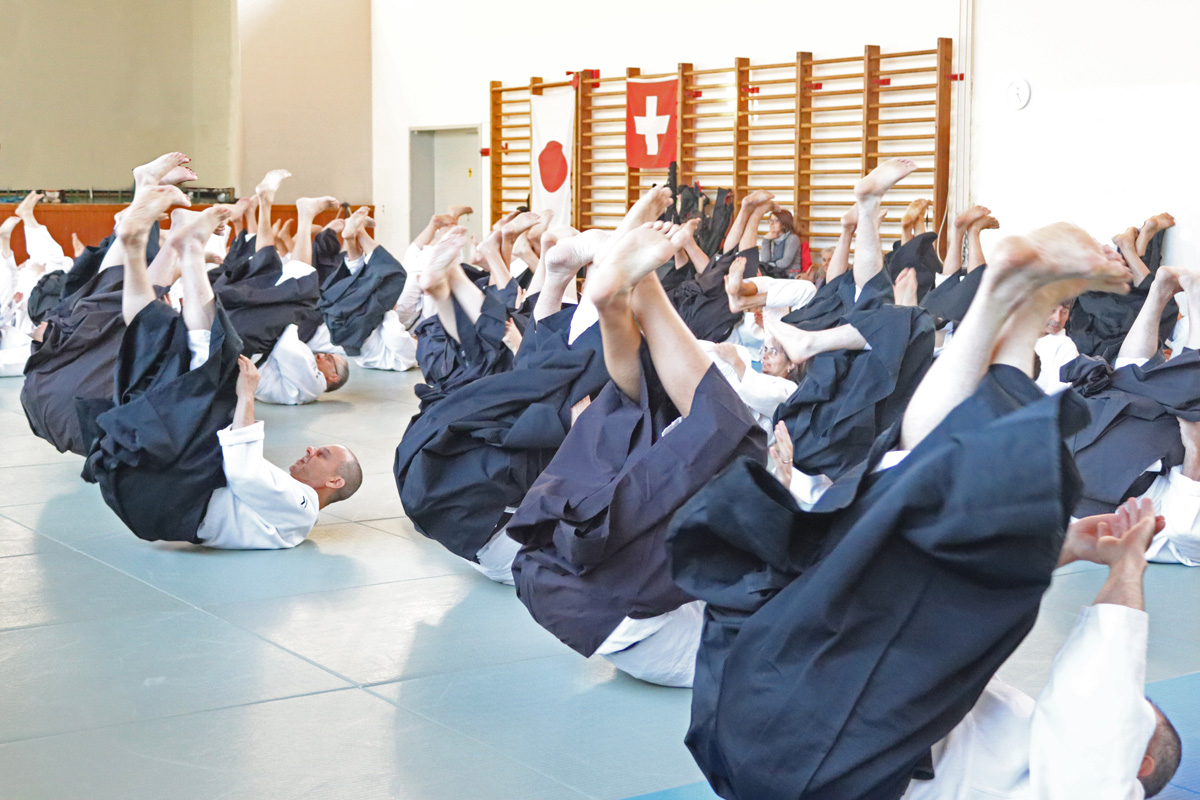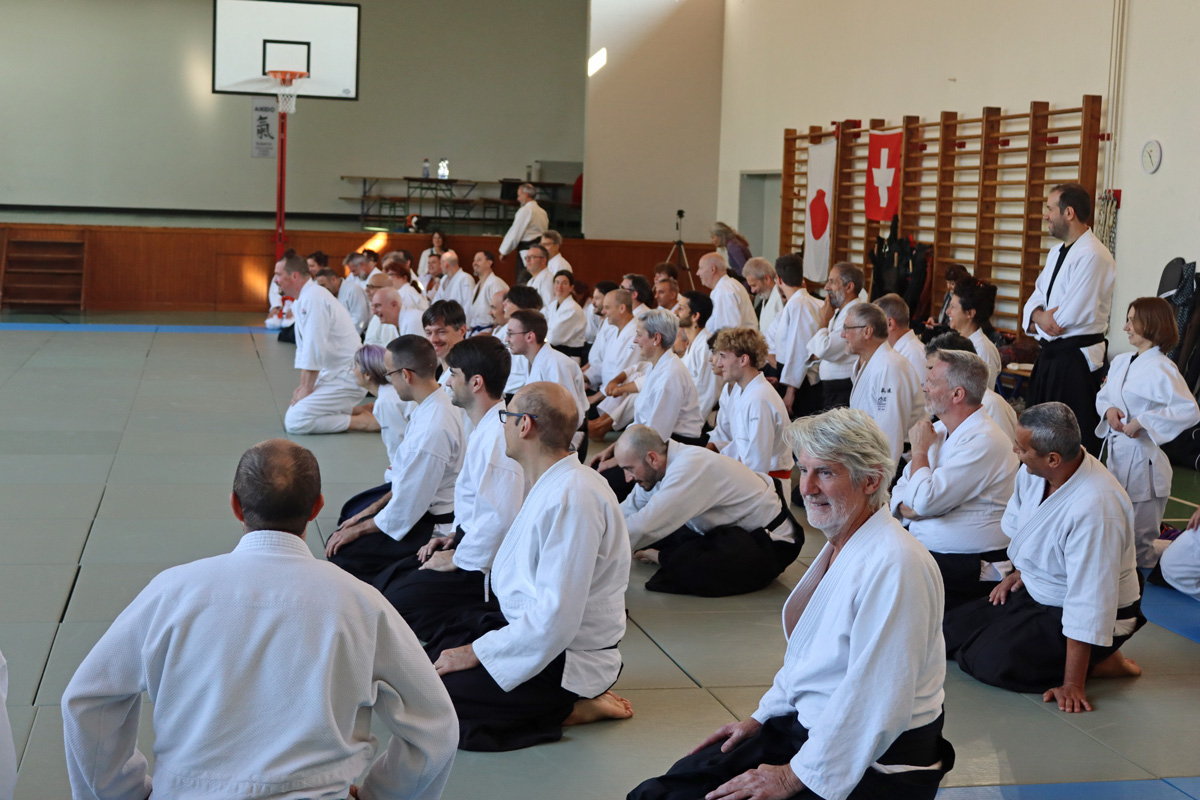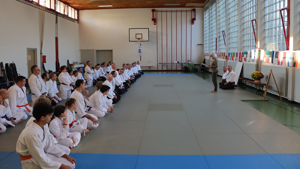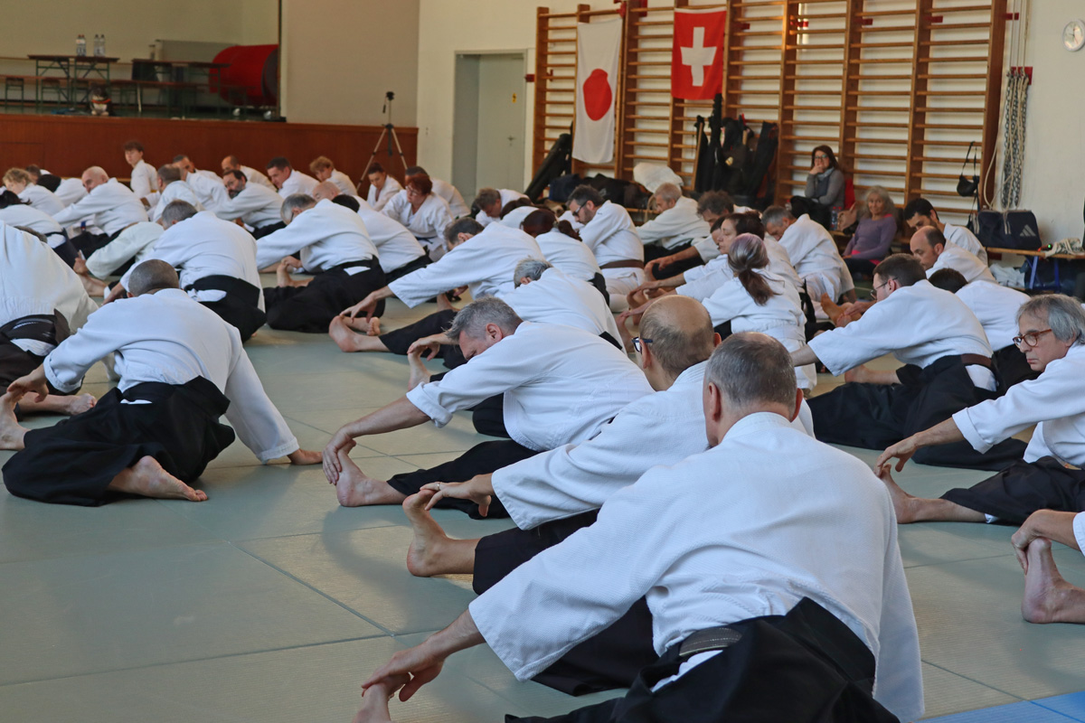 Schon am Freitagabend war die Matte gut gefüllt mit Teilnehmern aus der Schweiz, aus Ronchamp, aus Norditalien, aus Wien, aus Prag und aus Nürnberg. Eine grosse Gruppe aus Lüttich vom Ki Aikido de Sclessin war zwar zeitig in ihrer Unterkunft, der Casa Zen in Balerna, angekommen. Aber nach der langen Reise von 800 km in 5 Autos wollten sie sich erst einmal etwas ausruhen und nahmen am Freitagstraining noch nicht teil.