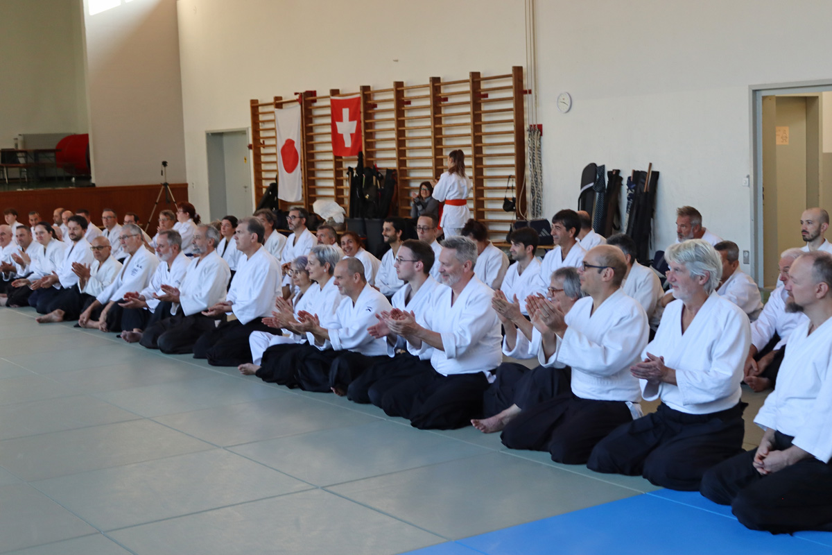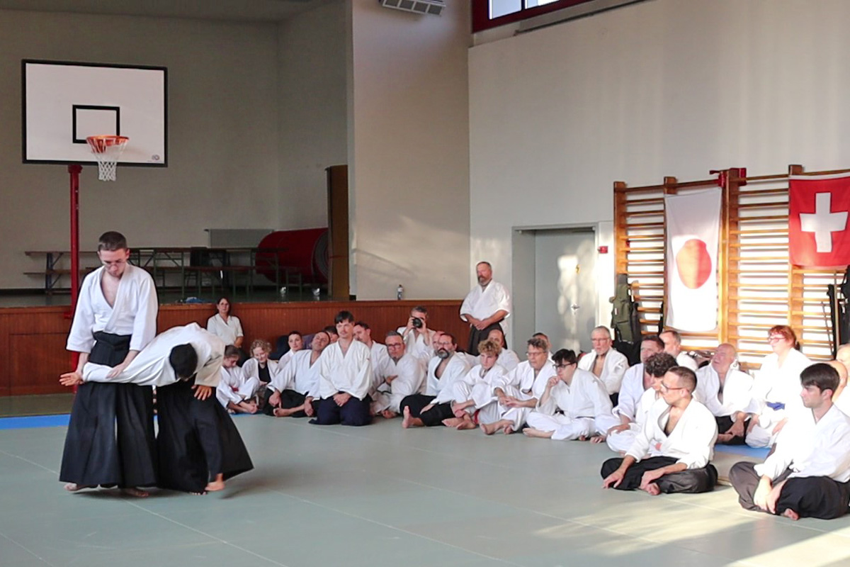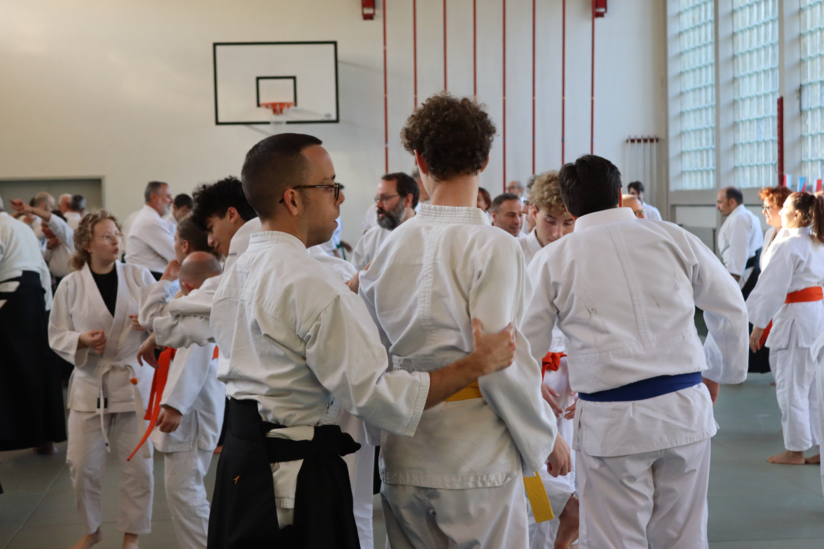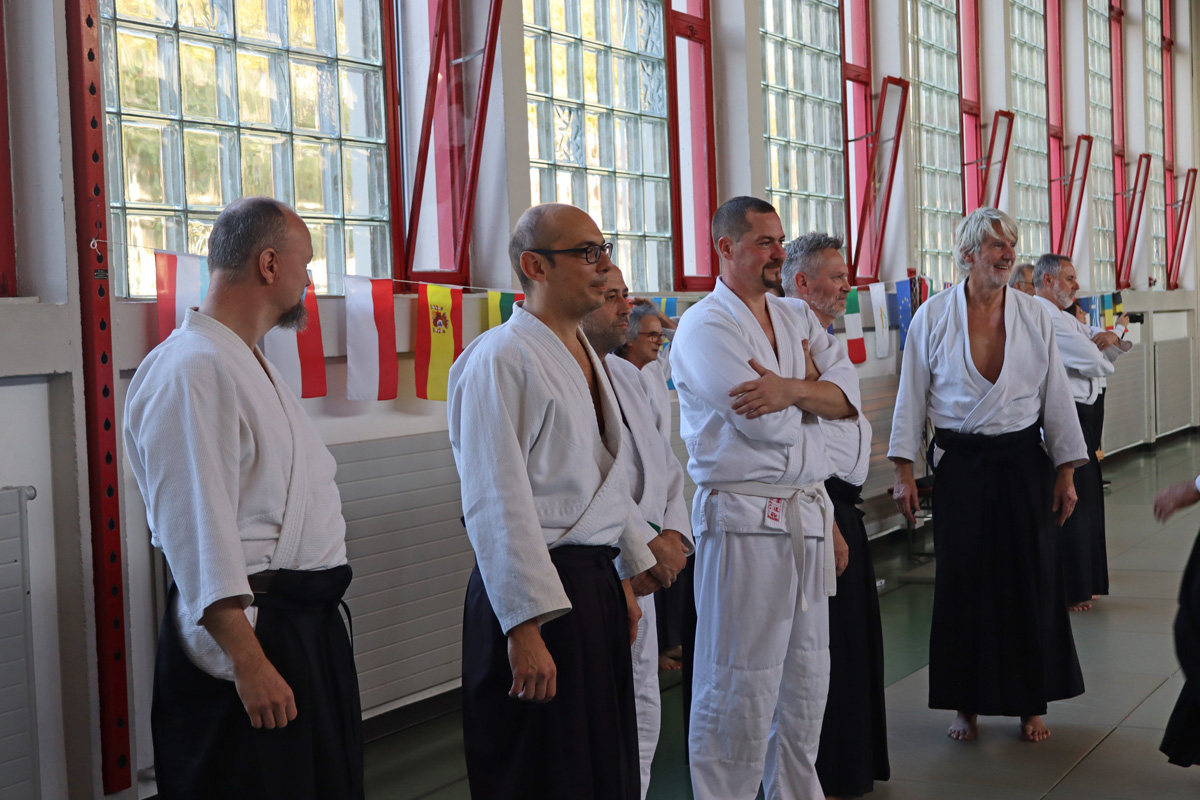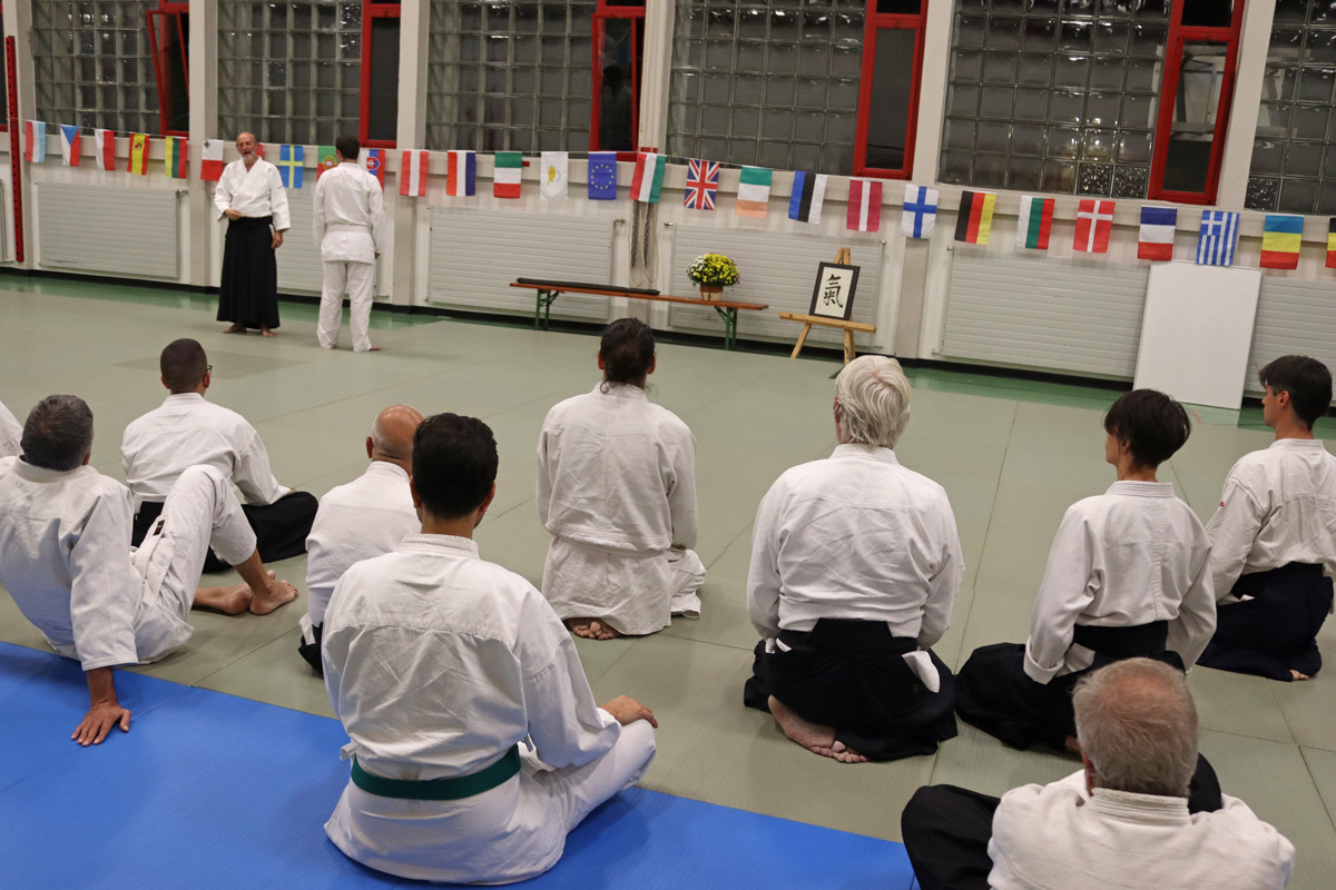 Schon am Freitagabend war die Matte gut gefüllt mit Teilnehmern aus der Schweiz, aus Ronchamp, aus Norditalien, aus Wien, aus Prag und aus Nürnberg. Eine grosse Gruppe aus Lüttich vom Ki Aikido de Sclessin war zwar zeitig in ihrer Unterkunft, der Casa Zen in Balerna, angekommen. Aber nach der langen Reise von 800 km in 5 Autos wollten sie sich erst einmal etwas ausruhen und nahmen am Freitagstraining noch nicht teil.