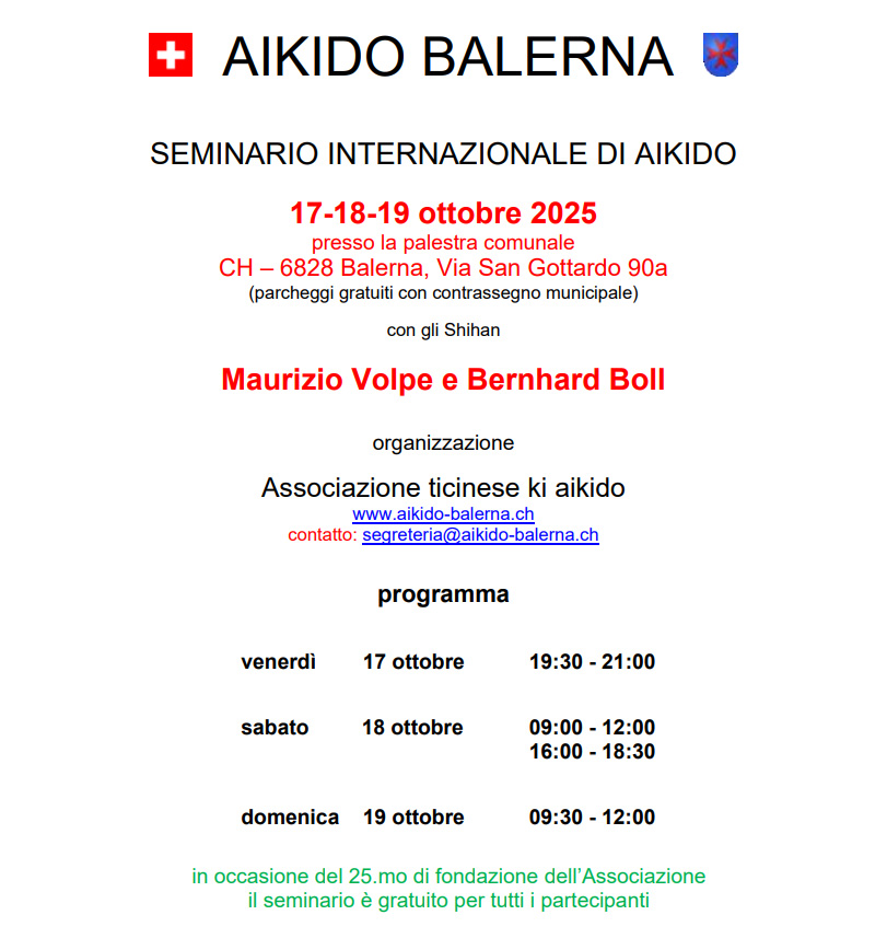 Durante il fine settimana 17-18-19 ottobre 2025 si è svolto l’annuale seminario internazionale di Aikido nella palestra comunale di Balerna, organizzato dalla locale Associazione Ticinese Ki Aikido (ATKA) e diretto dagli Shihan Maurizio Volpe e Bernhard Boll.