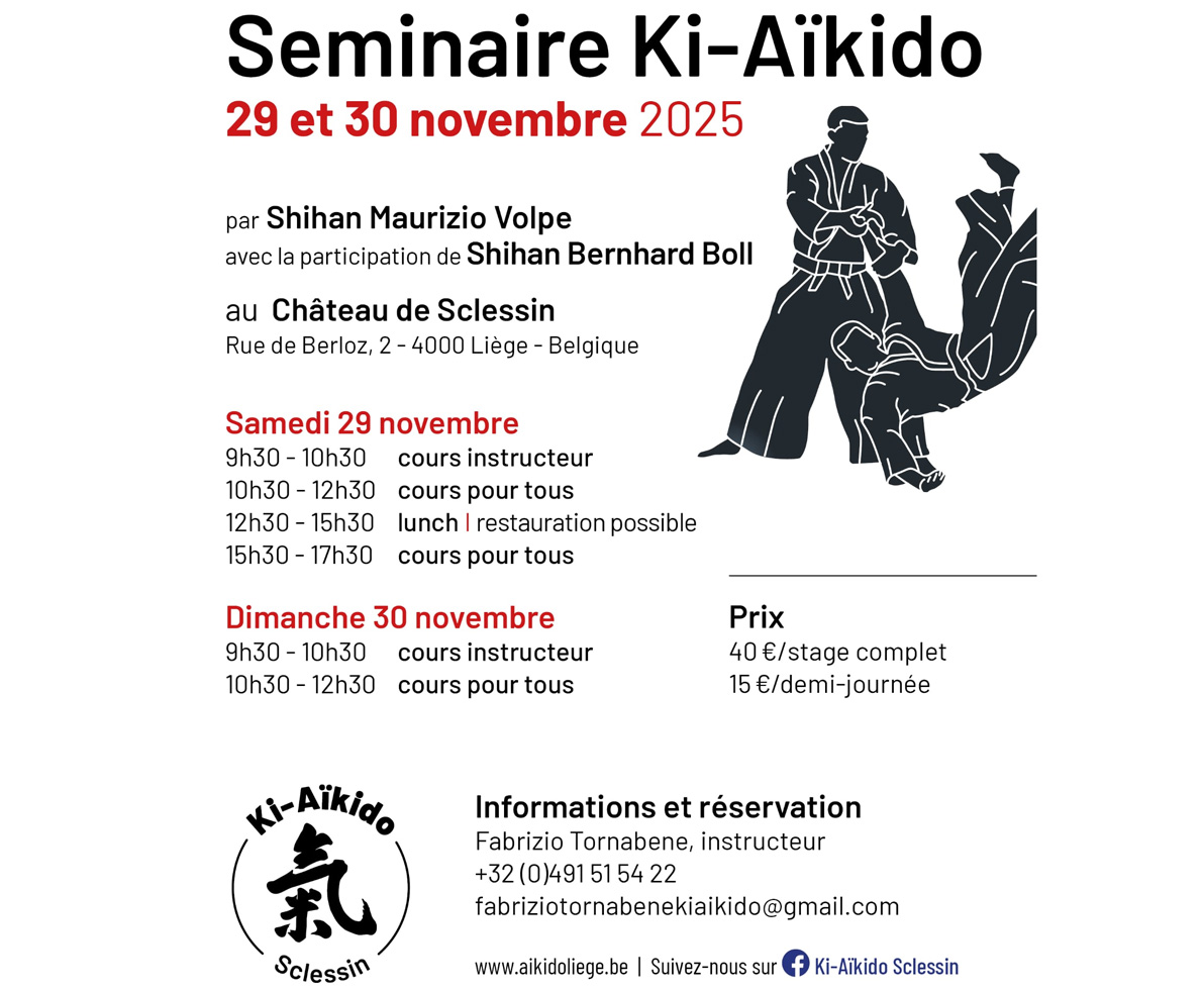 Ki Aikido Sclessin in Liège had invited Maurizio and Bernhard for the second time to teach a seminar on November 29th and 30th, 2025. After the Sclessin aikidoka had traveled to Balerna with a large group in October, Dzenan also decided to join them. As in the previous year, Vincenzo was also present. Unfortunately, Maurizio had to cancel his participation at short notice due to personal reasons.